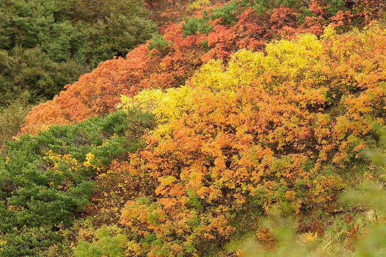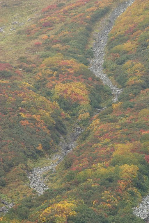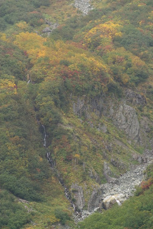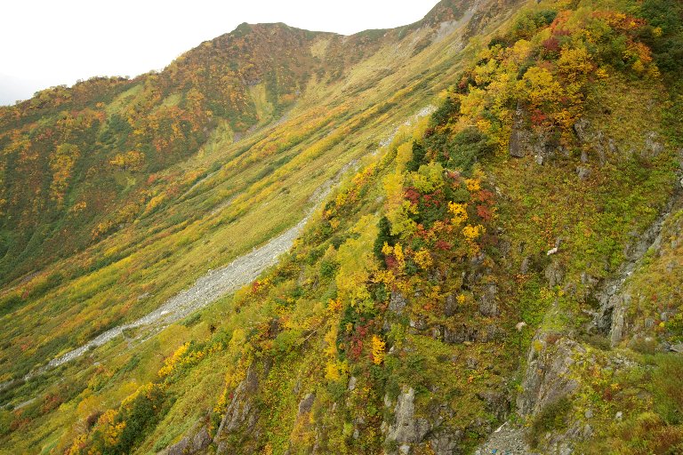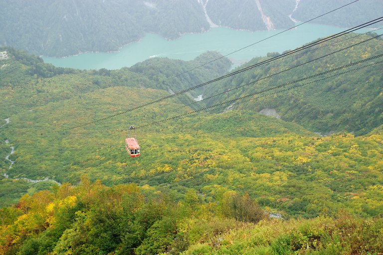 これは黒部平から大観峰付近を仰ぎ見て撮った写真です。向こうは真っ盛りという感じですね。ちなみにこの写真、硬調にすればもっと派手になりますが見た目に近くした結果、地味目になりました。雨中、1.6km先を撮った写真だしねぇ。