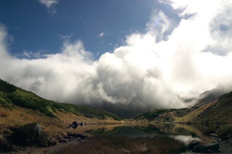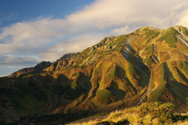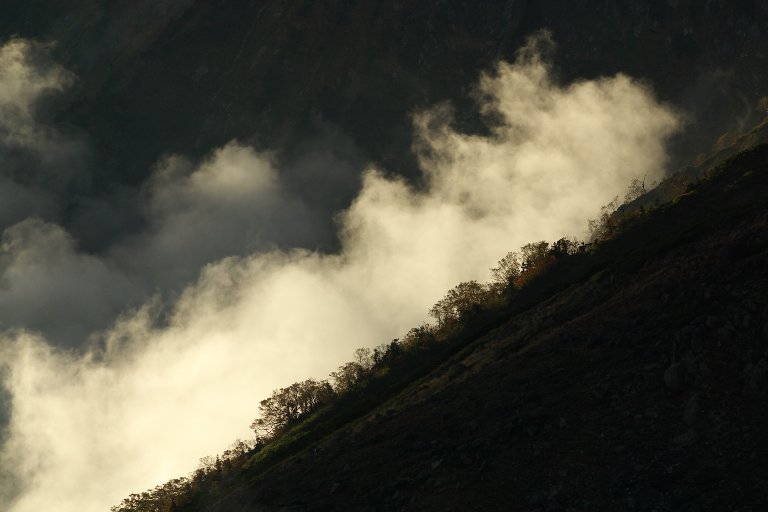 夕方、急に陽が射してきました。谷間の陰影や斜面を伝う雲が美しくて。