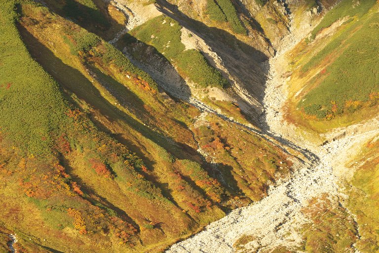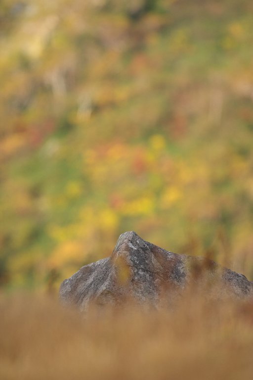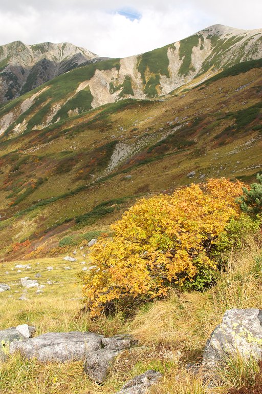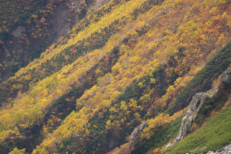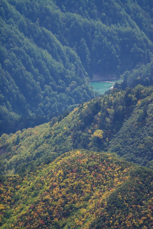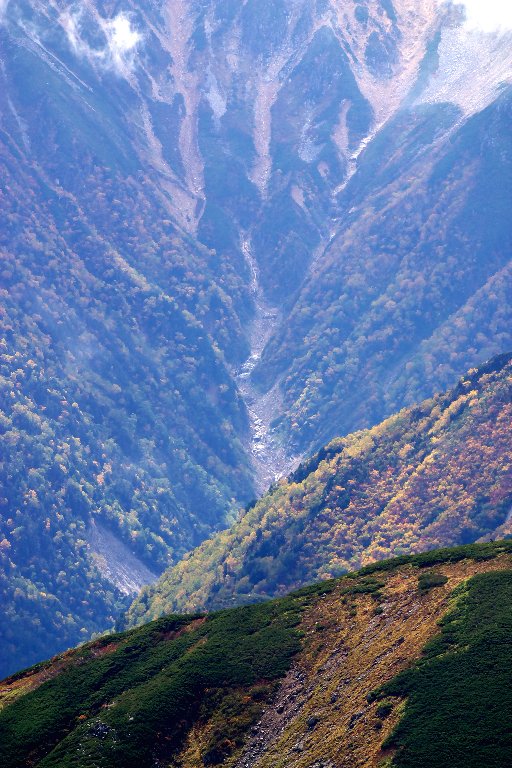 で、一の越から。左は黒部湖、右は方向からしたら東沢谷なのかな?よくわからんです。で、今回のベストは、きっと中央の一枚かな。一の越から右下の斜面を見たものですが、黄色と緑のコントラストが見事。光加減もよく、写真はさておき、ずっとファインダーを覗いていたい気分でした。