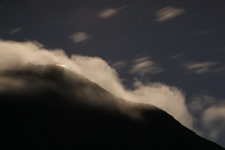 月夜の雄山。夕暮れ直後はよい天気でした。それだけに月夜の雲海を期待していたのですが、夜半から雨となってしまいました……。