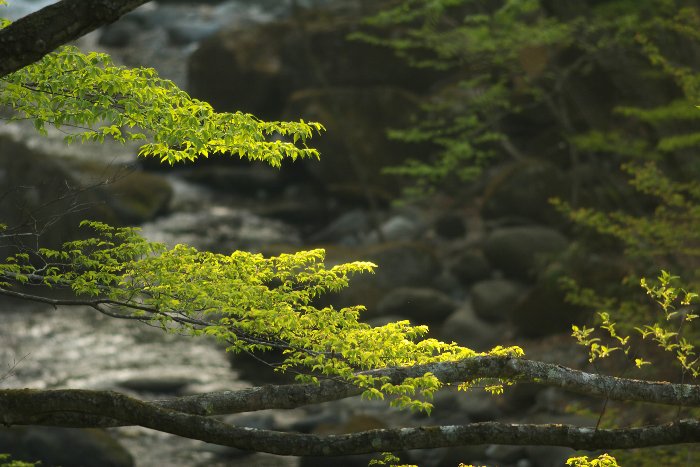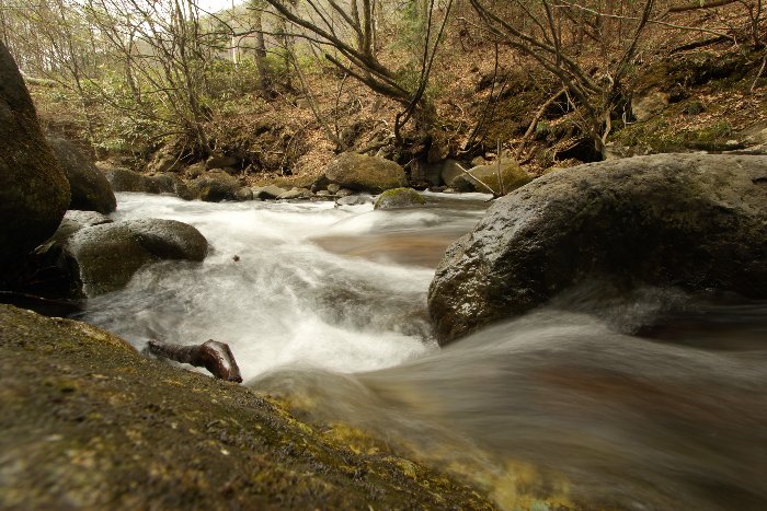 雪解けの流れは水量が豊富で。ただ、まだ緑は少なく、絵にするにはちょっと難しいような。