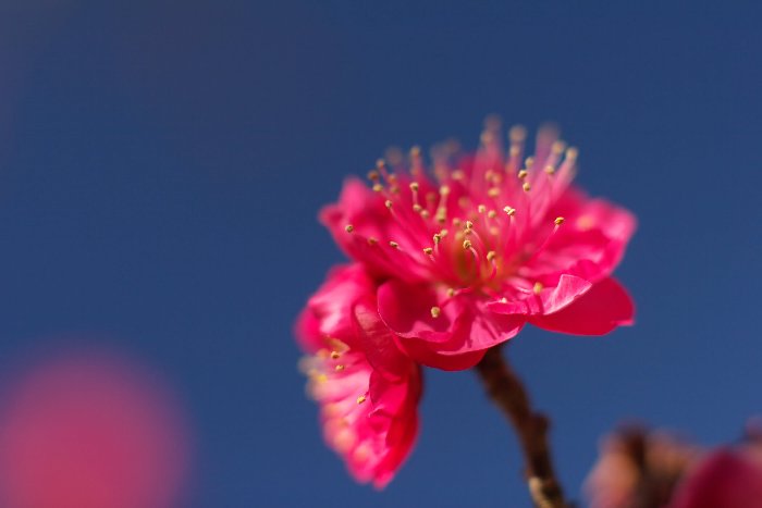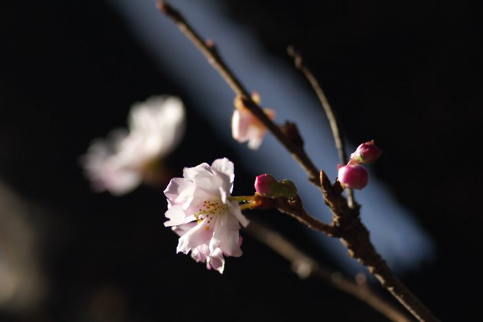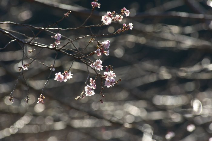何でこんな時期に……って、寒桜か。上は光る枝が背景なんですが、さざ波みたいな印象でした。