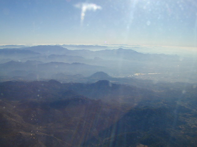 さらに,飛行途中の湖(中)に山々(右).印象は中国の墨絵.これで窓が綺麗だったらよかったのに,あいにく窓は傷だらけ.さておき,エアロゾルが多いんだろうな,などと仕事のようなことを思ったり.