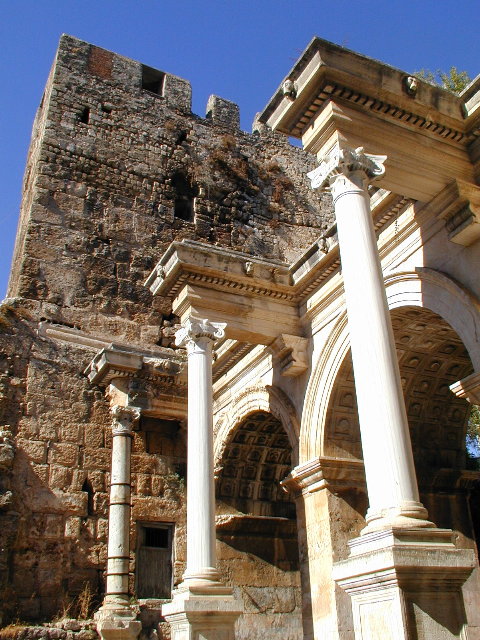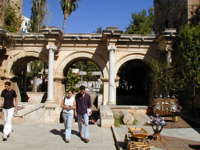 さて,アンタルヤの名所の1つ,ハドリアヌス門です.ガイドブックに載っていたのが左のような写真だったので,大きいとは思っていなかったのですが,実際には半分地面より下なので,かなり大きいです.近くで見ると迫力(中).