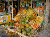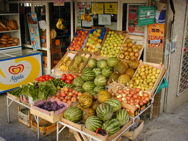 アンタルヤの街を走る電車,旧市街の店の前,そして野菜屋さん.何かにつけてメロン,スイカ,ブドウを食べたっけ.