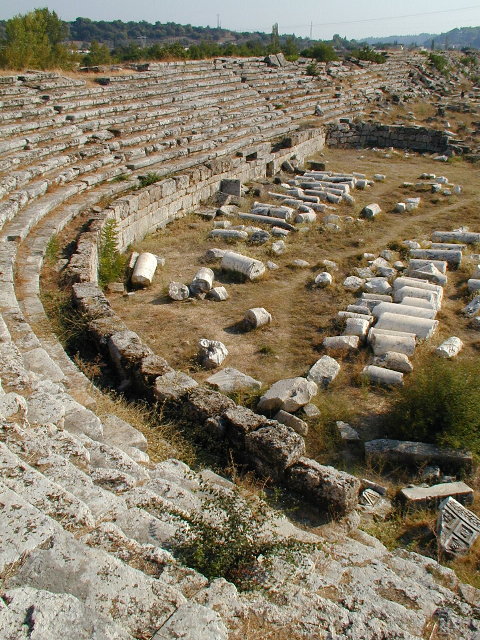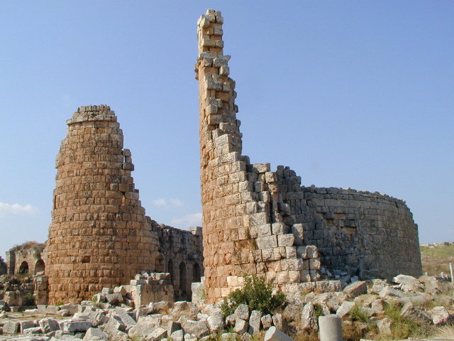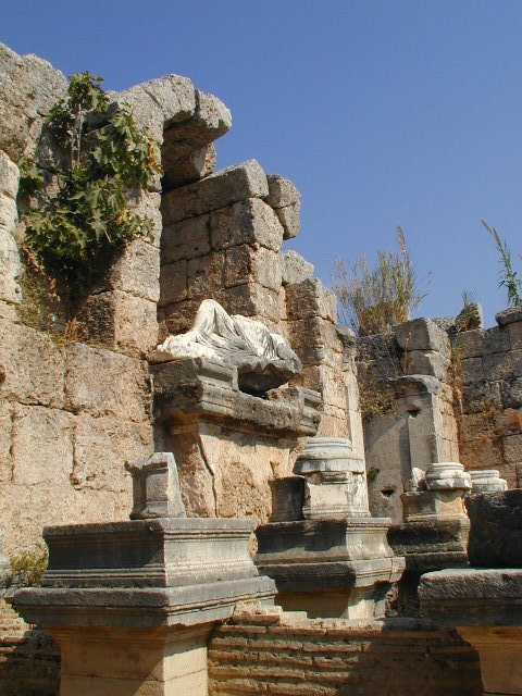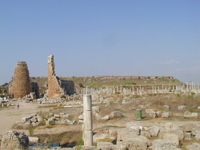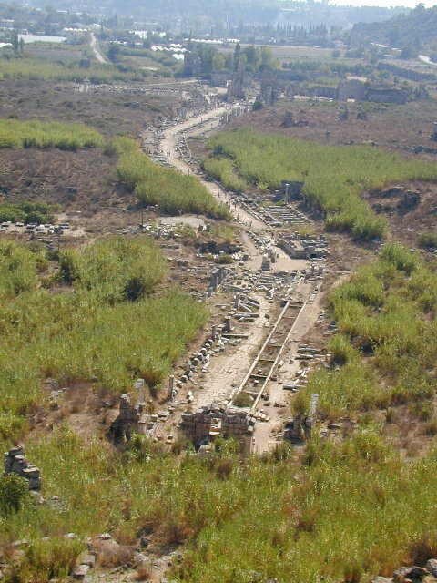さて,ペルゲ入り口の脇には競技場跡なんてものもありました(左).こちらもなかなかに.転がっている柱の残骸が全部大理石らしいことに気付いて,なんか身震いしたりもしましたが.ついでにちょっと先には劇場跡もあるのですが,こちらは立ち入り禁止.どうも崩壊直前で危ないらしいのです.フェンスに囲まれてました.